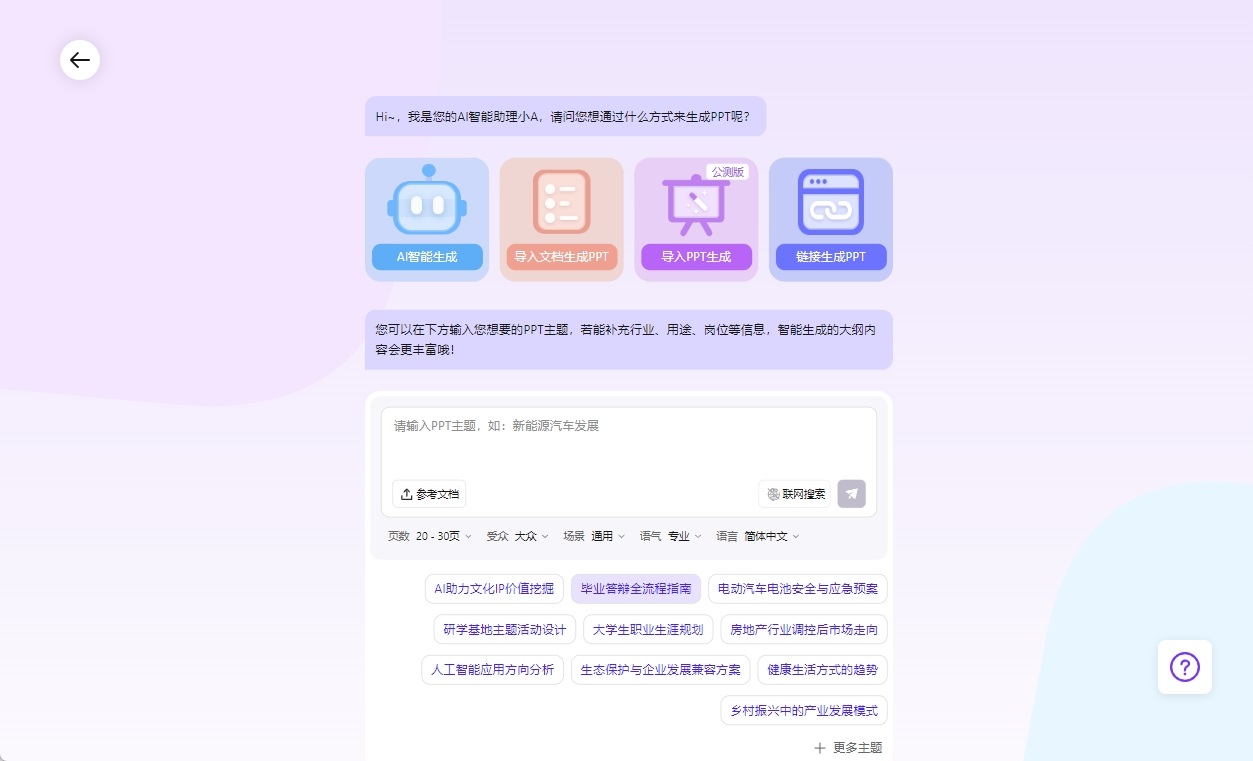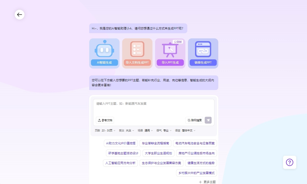 1、打开AiPPT电脑版,在大纲生成页点击【AI智能生成】,输入想要的PPT主题