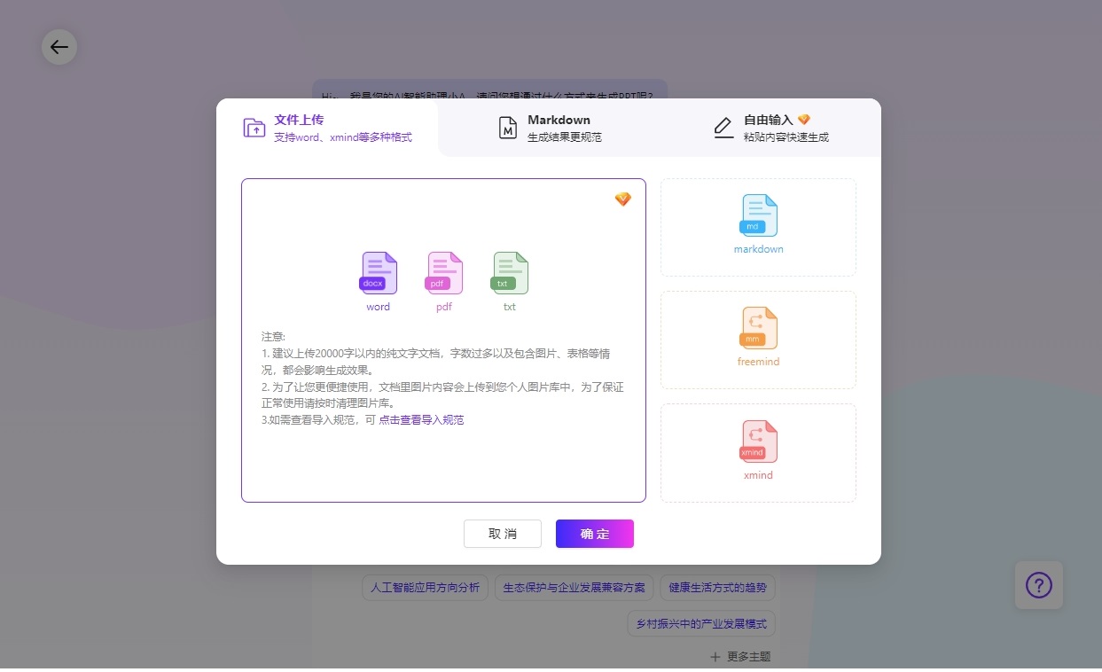 1、在首页点击【开始智能生成】,进入大纲生成页点击【导入文档生成】