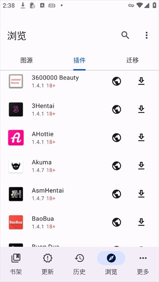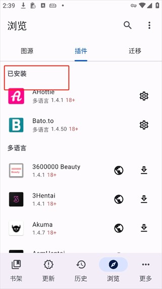 6、根据自己想看的漫画,安装不同插件即可(第三方仓库和插件由爱好者们提供,对于它们的可信度需要您自己进行选择和判断)