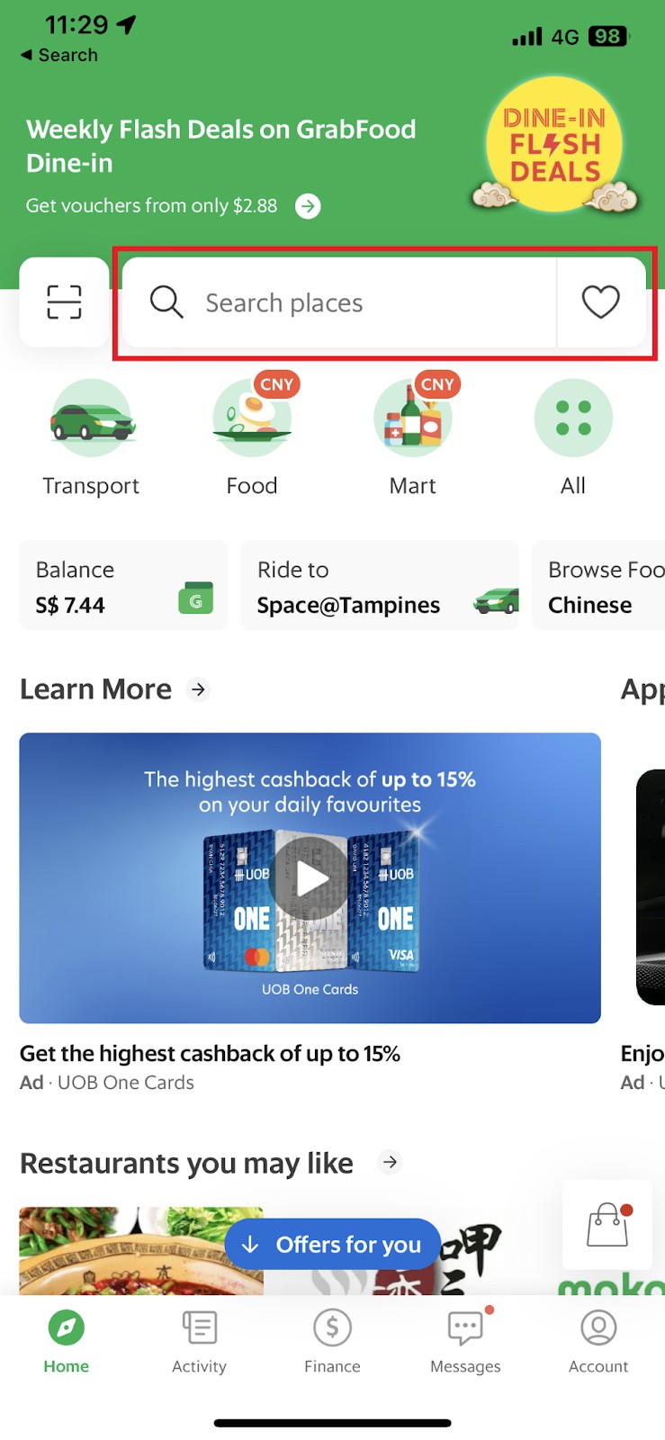 1、打开Grab旅行app,在首页点击最上方搜索框