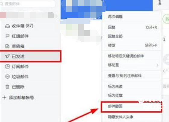 2、找到左侧列表,选择已发送,找到发送的邮件,右击选择撤回即可。