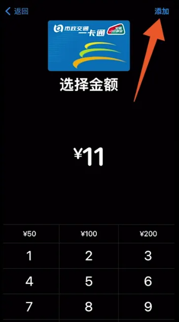 9、切换页面后,输入充值【金额】,点击页面右上方的【添加】,就可以使用Apple Pay进行免密接触支付。