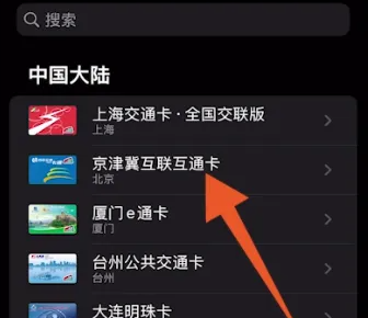7、打开交通卡这个页面打开后,在列表中选择一种交通卡并点击,以京津冀互联互通卡为例。