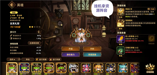 1.挂机阵容:经我在有限资源下反复测试,此阵容效果最佳。蓝色小恶魔获取难度较低,金色机械老头与半神男若难以获取,可用噬月和紫老鼠替代,机械天使在阵容中主要起补充作用。