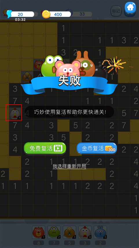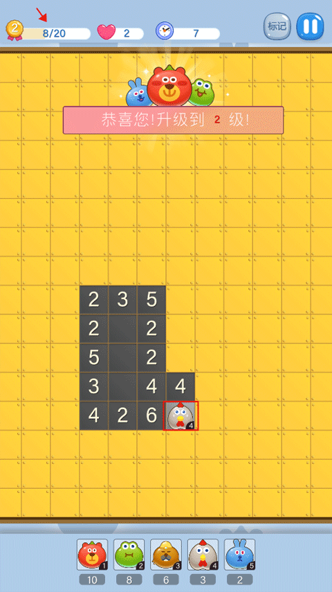 6.游戏玩法为先随机点击黄色框,此时会显示数字,该数字表明周边有不同等级怪兽,点击低或同等级怪可升级或加经验。