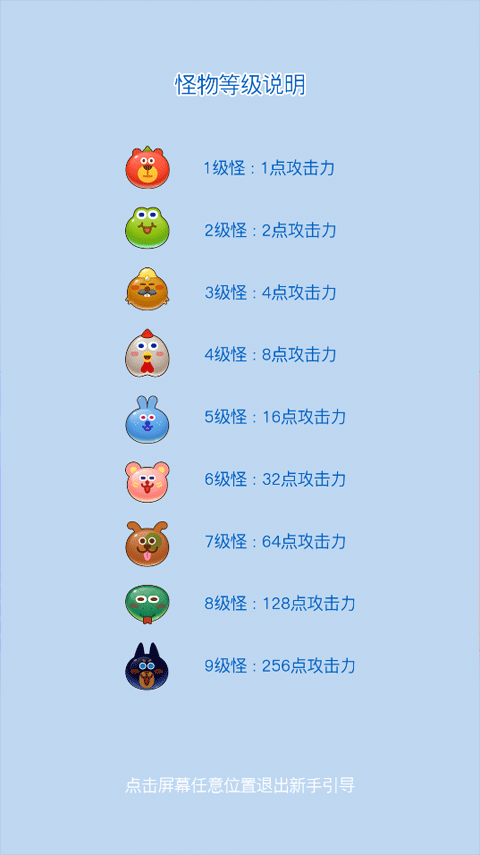2.进入游戏后,新手指导页面会出现,格子数字代表周围怪兽等级总和,且不同等级怪兽攻击力有差异。