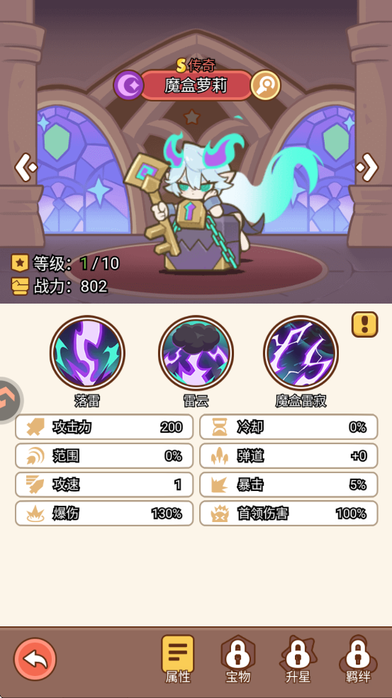 属性是暗,必杀技为【魔盒雷寂】,打开魔盒,雷元素形成巨大鸟云落下雷电,对全屏幕敌人造成伤害并禁锢2秒,冷却时间为25秒。