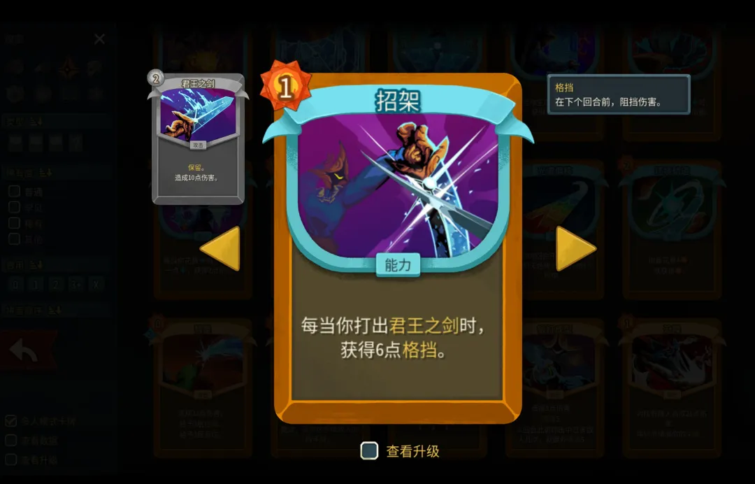 要是巨剑费用为1费,我还会觉得它是张不错的起防卡。可实际情况是2费的巨剑不仅数值低、成长慢,打出后要么得靠其他卡牌弥补,要么就得等下一轮洗牌,巨剑出手频率低和招架数值低真是“相得益彰”。