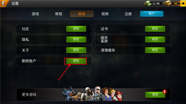 3.进入“其他”选项后,选择删除当前账户,如此便能以全新状态重新开始游戏。