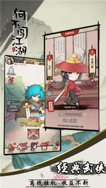 何不闯江湖是放置挂机类武侠RPG手游,一键放置角色自动冒险,轻松升级不爆肝。游戏秉持公平理念,不氪金也能凭借智慧策略成为大侠。丰富装备道具助力提升实力,还有社交互动玩法,书写江湖传说。