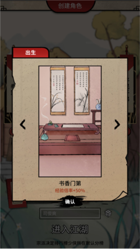 3.选择书香门第出身,游戏过程中经验获取倍率将提高50%。
