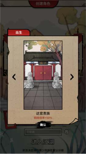 2.若是达官贵族出身,在游戏里能获得铜钱获取倍率增加50%的加成。