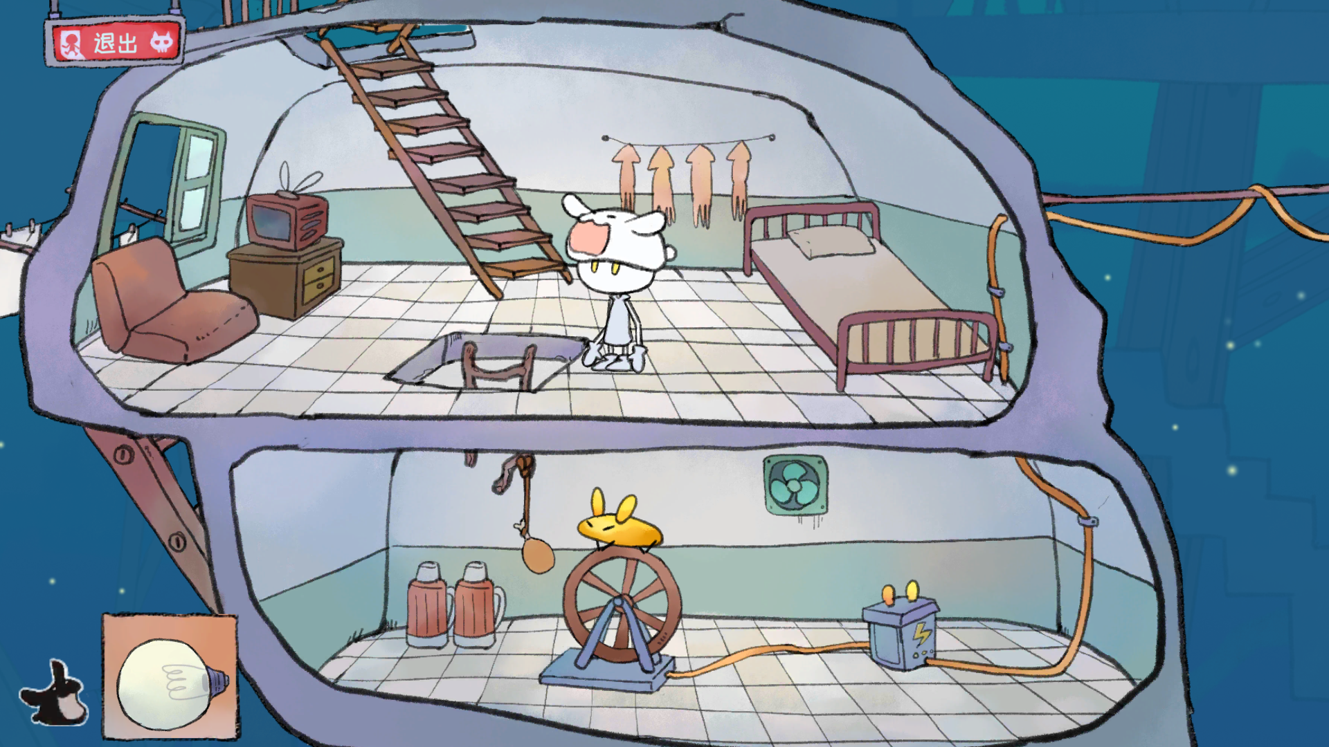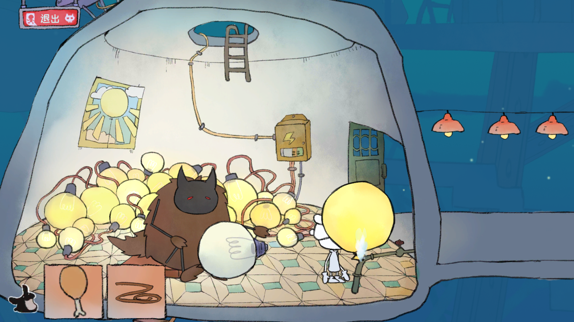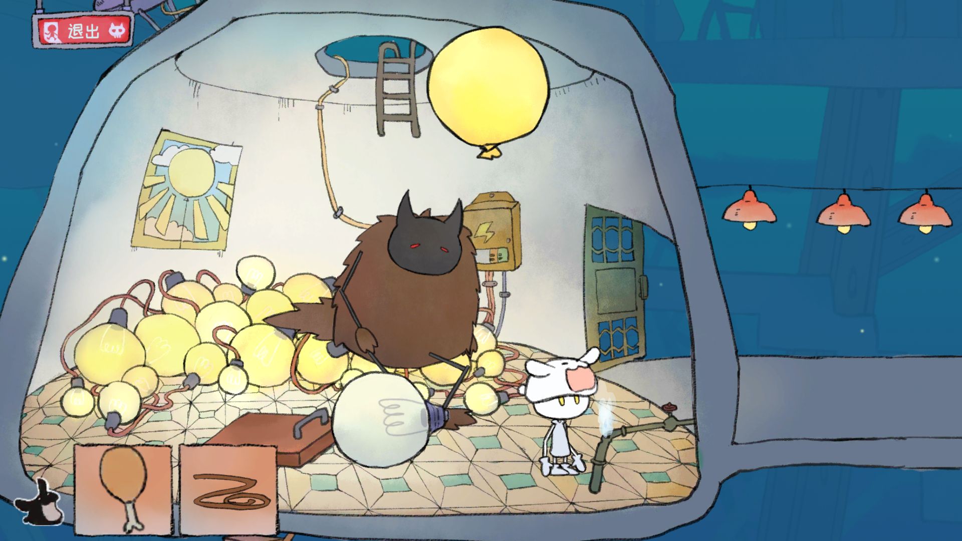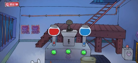 进去后有个在煮饭的人,开始能进(后来好像是不让你进去,你要随便拖东西到锅那几次,搞出水雾就可以了)捡鸡腿,然后向右下去拿气球,就是下面好像是第二个气球,你会发现有绳子加气球了,回去那个煮饭的房间,向左走,把气球拖到水管那,气球就会飞起来(气球装水会飞?)那个胖子会站起来,留下灯泡。搞到灯泡,顺着他坐的那个地方下去,把绳子拖到破楼梯上,把鸡腿绑上,兔子就开始发电了。去拿气球的那个地方,把灯泡放下,去量身高