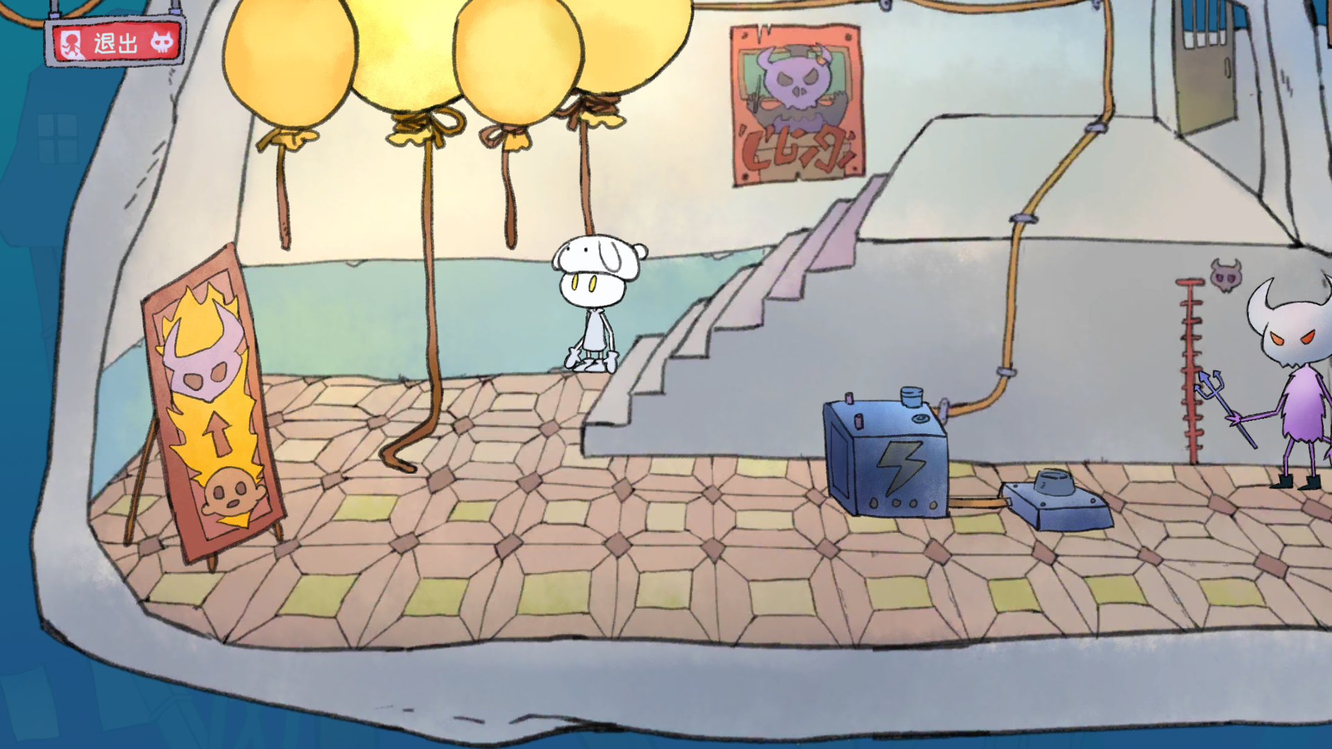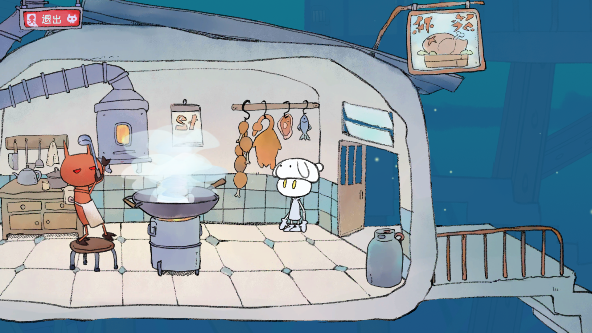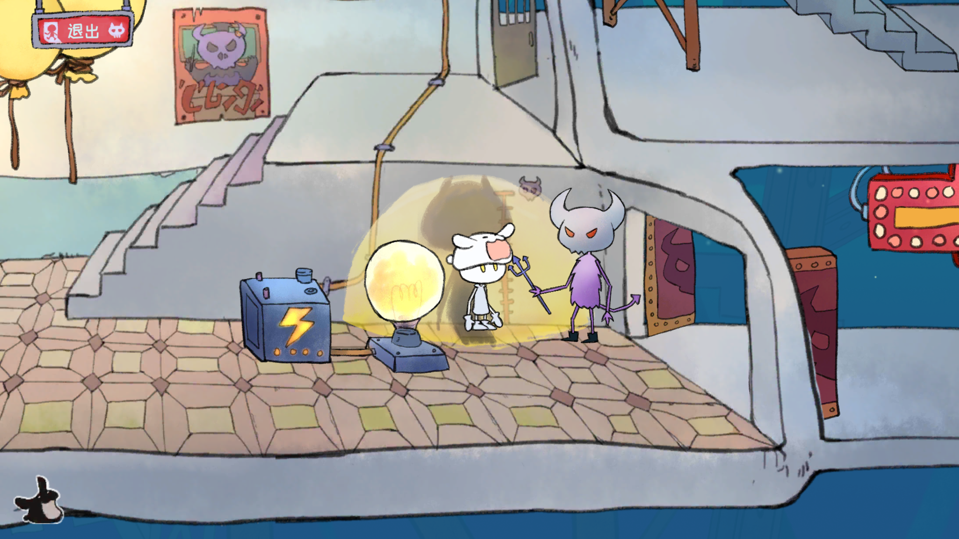 进去后有个在煮饭的人,开始能进(后来好像是不让你进去,你要随便拖东西到锅那几次,搞出水雾就可以了)捡鸡腿,然后向右下去拿气球,就是下面好像是第二个气球,你会发现有绳子加气球了,回去那个煮饭的房间,向左走,把气球拖到水管那,气球就会飞起来(气球装水会飞?)那个胖子会站起来,留下灯泡。搞到灯泡,顺着他坐的那个地方下去,把绳子拖到破楼梯上,把鸡腿绑上,兔子就开始发电了。去拿气球的那个地方,把灯泡放下,去量身高