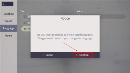 5.在弹出的确认页面中,点击下方确认按钮,等待游戏重启就能完成中文设置。