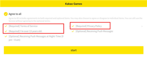 2.进入后是权限服务选择界面,标有【Required】即红框内的为必填项,含游戏须知、年龄和服务条款,选好其他消息推送等选项后即可开始游戏。
