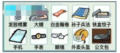 【发胶喷雾】,【大嫂】,【白金汉卷】,【孙子兵法】,【铁盒饺子】、【手机】,【手表】,【眼镜】,【外卖帽子】,【公文包】。