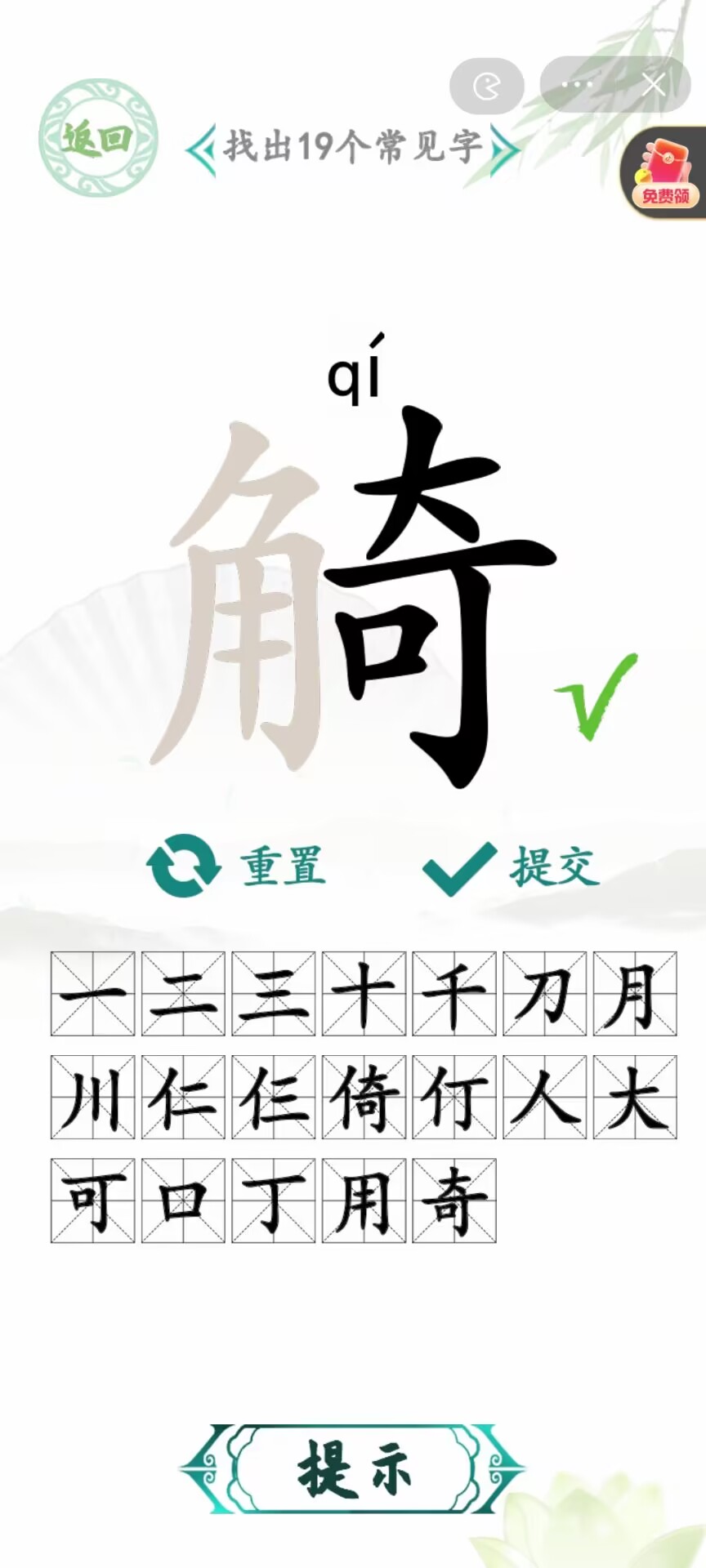 汉字找茬王是抖音中爆火的小游戏之一,需要根据图中给出的生僻字中拆字找出常见的字,本关为觭(qi),完整的通关答案为一、二、三、十、千、刀、月、川、仁、何、仨、倚、仃、人、大、可、口、丁、用、奇、角、觭。