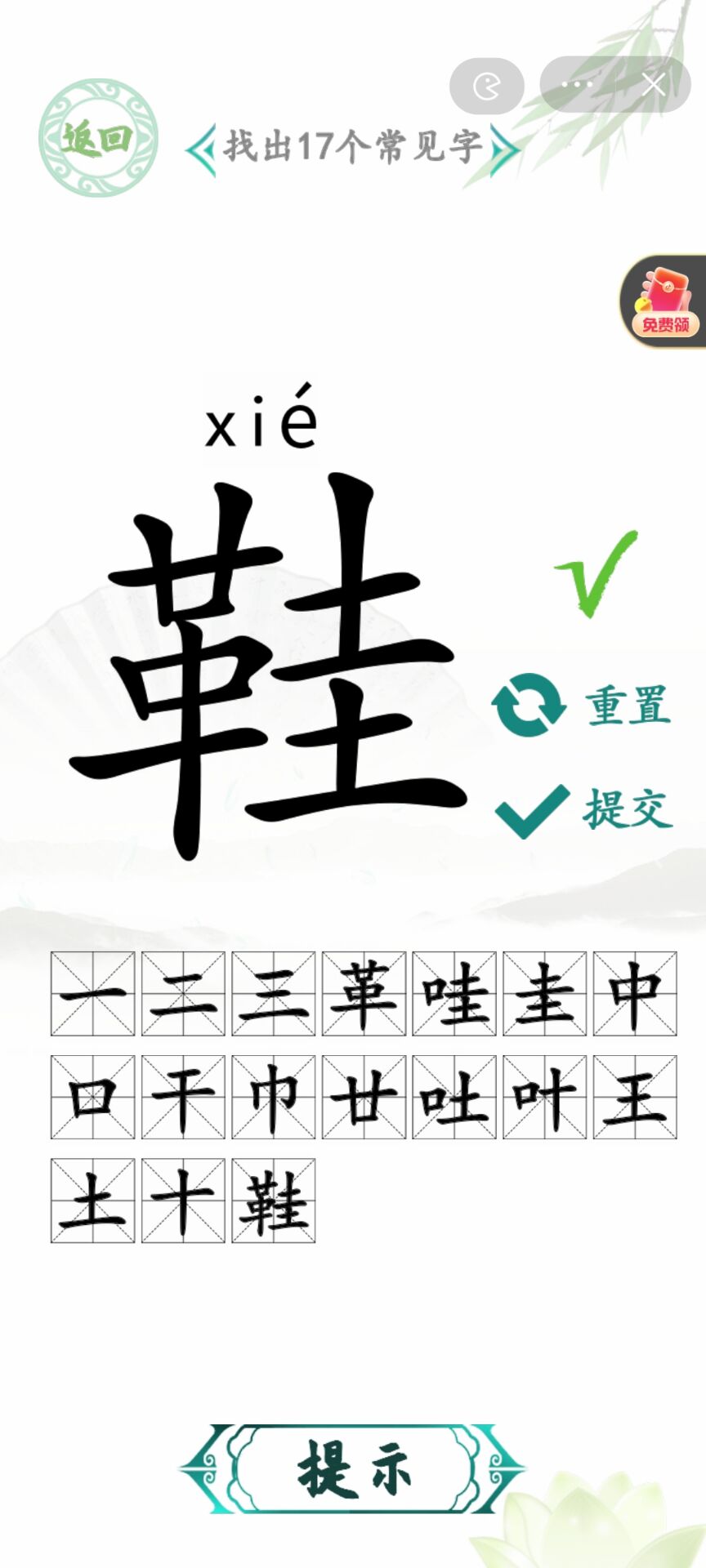 汉字找茬王是抖音中爆火的小游戏之一,需要根据图中给出的生僻字中拆字找出常见的字,本关为鞋,完整通关答案为一、二、三、革、哇、圭、中、口、干、巾、廿、吐、叶、王、土、十、工、三、二、一。